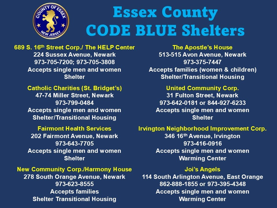 Did you know? Code Blue Protocols are enacted when the temperature is forecasted to drop below 32 degrees or due to inclement weather. To support families and individuals, Essex County Executive Jo...