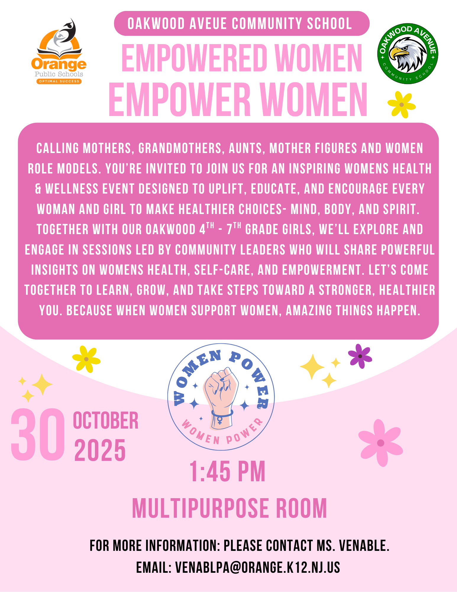 Together with our oakwood 4th - 7th grade girls, we’ll explore and engage in sessions led by community leaders who will share powerful insights on women's health, self-care, and empowerment. let’s come together to learn, grow, and take steps toward a stronger, healthier you. because when women support women, amazing things happen.