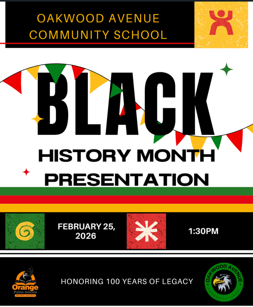 Oakwood Avenue Community School is excited to welcome you to our Black History Month Celebration on Wednesday, February 25, 2026, at 1:30 PM. This year, all students will play a part in the celebration.